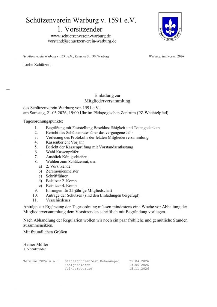 Am 21. März 2026 findet um 19.00 Uhr die jährliche Mitgliederversammlung des Schützenverein Warburg von 1591 e.V. im Pädagogischen Zentrum (PZ) statt. Hierzu ergeht an alle Mitglieder des Vereins eine ausdrückliche Einladung. Schriftliche Einladungen durch den Vorsitzenden sind bereits unterwegs.